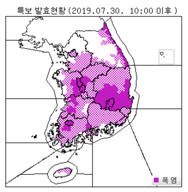 기상청은 29일 오전 11시 서울, 부산, 경기 일부, 강원 일부, 충남 일부, 충북 일부, 전남 일부, 전북 일부, 경북 일부, 경남 일부, 제주 일부에 폭염주의보를 발효했다.