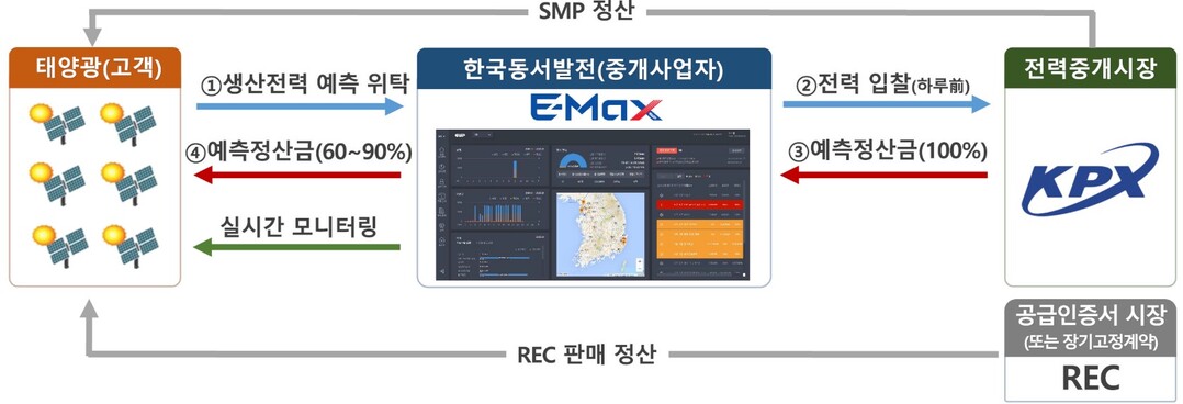 동서발전은 2021년 전력중개사업 브랜드 'E-Max'를 출시한 이후, 현재 754㎿ 규모의 태양광 및 풍력발전소를 운영하며 기존 발전수익 외 재생에너지 예측제도 기반 인센티브를 제공하고 있다.