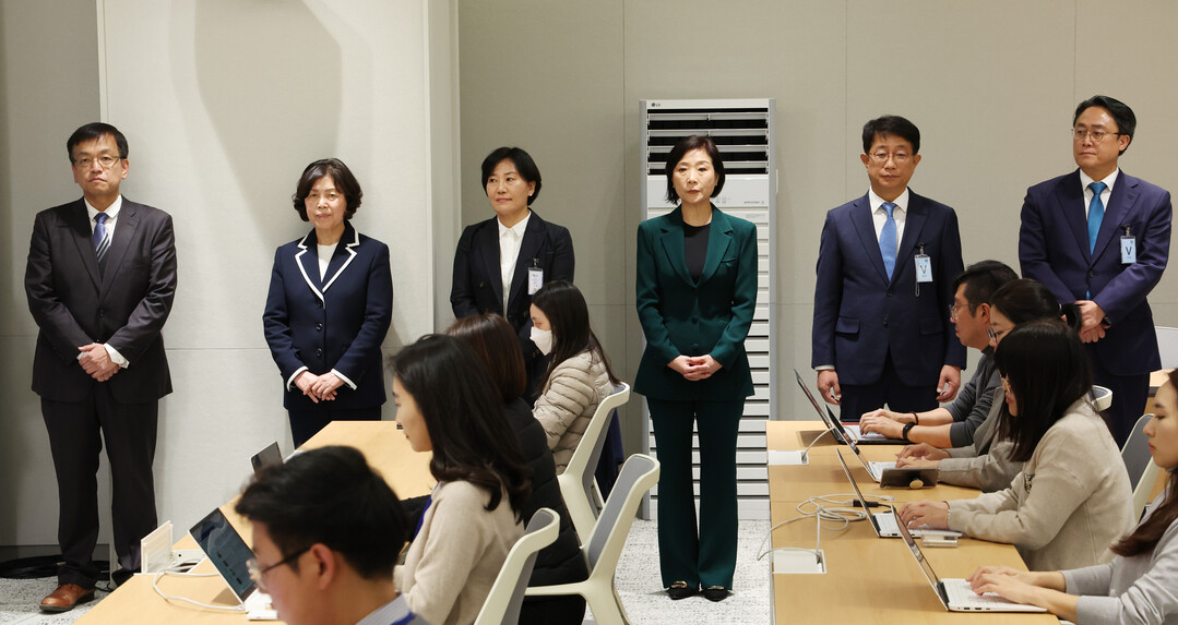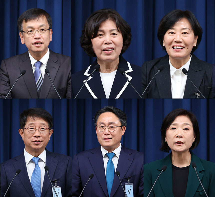 ▲ 대통령실 김대기 비서실장이 4일 서울 용산 대통령실 청사에서 6개 부처 개각 인선을 발표하는 새 장관 후보자가 대기하고 있다. 왼쪽부터 최상목 경제부총리 겸 기획재정부 장관 후보자와 강정애 국가보훈부, 송미령 농림축산식품부, 오영주 중소벤처기업부, 박상우 국토교통부, 강도형 해양수산부 장관 후보자. [뉴시스] |
