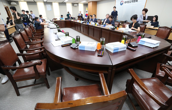 ▲ 13일 오전 정부세종청사 최저임금위원회에서 사용자 측 위원들이 불참한 채 제14차 전원회의가 열리고 있다. [연합뉴스 제공]