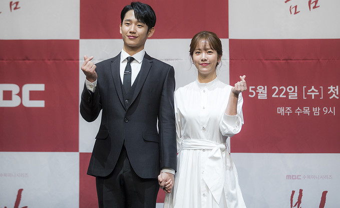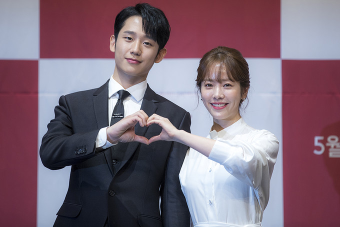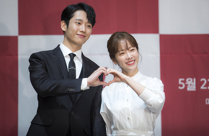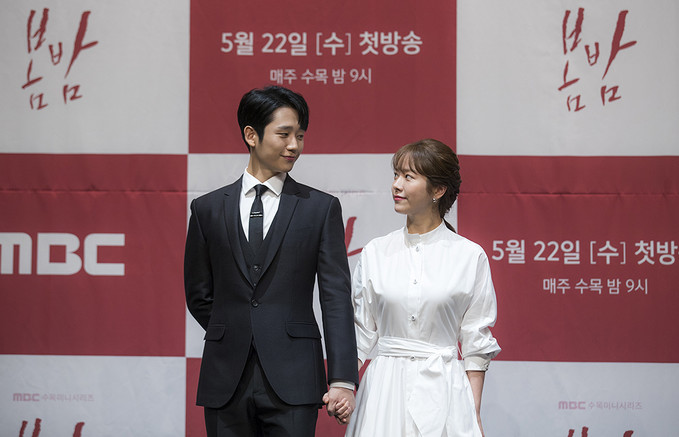 배우 정해인, 한지민이 20일 오후 서울 구로구 라마다서울신도림호텔에서 열린 MBC 수목미니시리즈 '봄밤' 제작발표회에서 포즈를 취하고 있다.