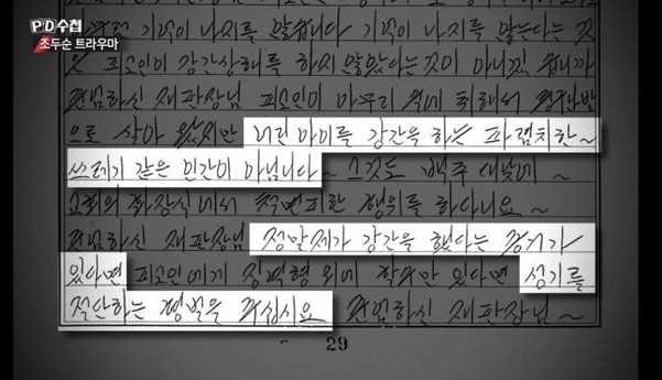 ▲ 지난 4일 방송된 MBC 'PD 수첩'에서 조두순의 자필 탄원서가 일부 공개됐다. [MBC 'PD 수첩' 캡처]