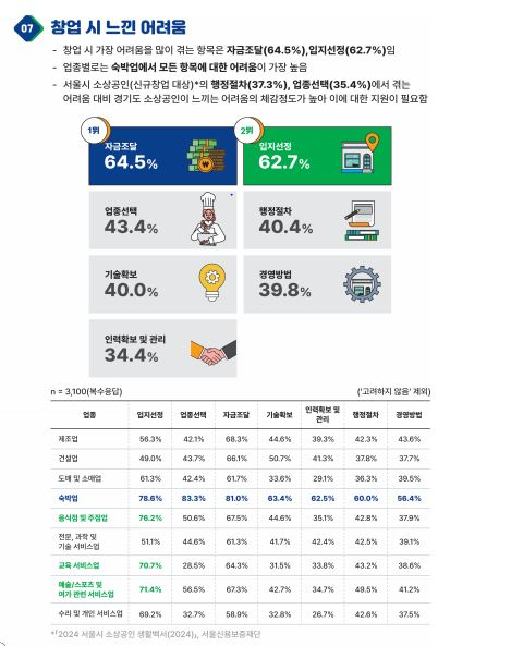 ▲ 백서에 수록된 경기도내 업종별 소상공인이 창업 시 느끼는 어려움 그래픽 자료.  [경기신보 제공]