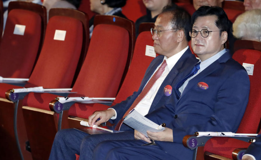 ▲윤재옥 국민의힘 원내대표, 홍익표 더불어민주당 원내대표가 3일 서울 종로구 세종문화회관에서 열린 제4355주년 개천절 경축식에 참석해 있다. [뉴시스]