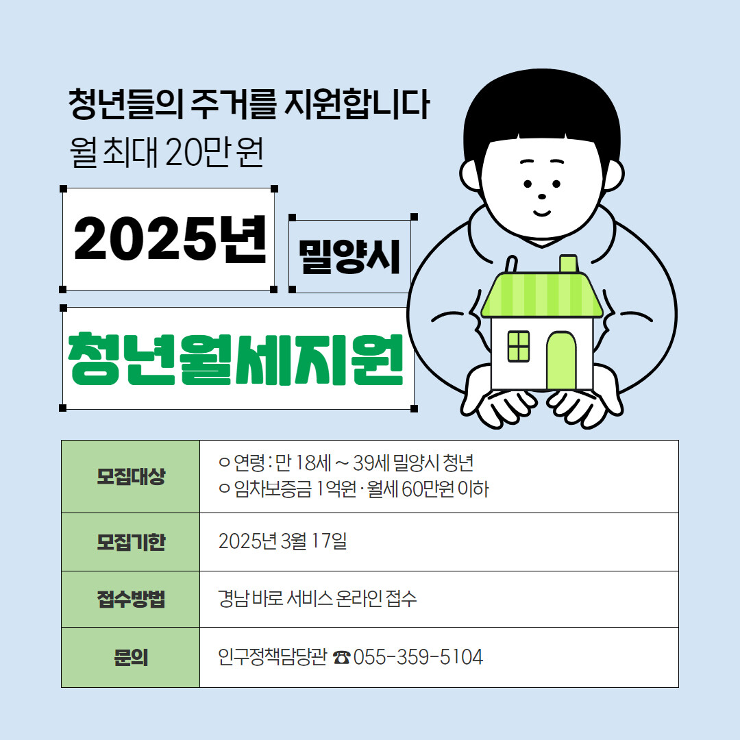 경남 밀양시는 청년층의 주거비 부담을 덜어주기 위해 '2025년도 월세 지원사업' 신청을 오는 3월 17일까지 받는다고 밝혔다.