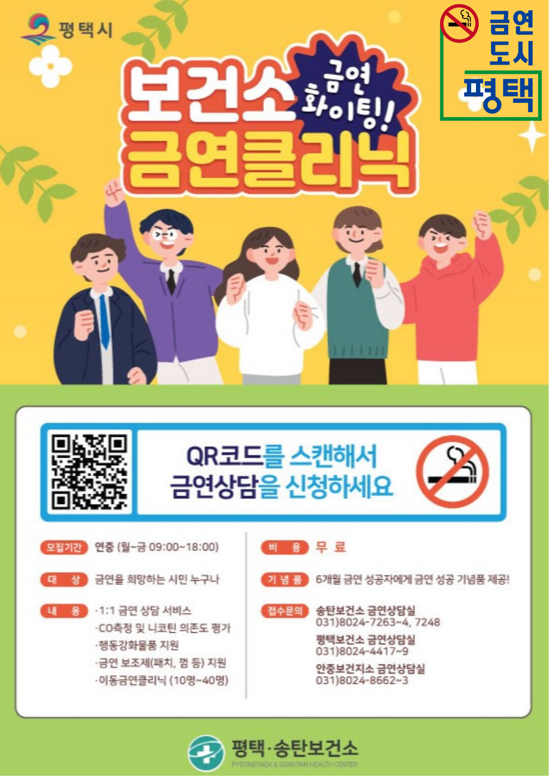 경기 평택시는 금연을 희망하는 시민들이 편리하게 금연 상담을 받을 수 있도록 '금연클리닉 QR코드'를 개설해 운영 중이라고 31일 밝혔다.