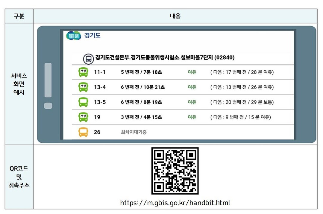 유병석 경기도 교통정보과장은 "이번 서비스로 정류소에 전광판이 설치돼 있지 않은 곳에서도 버스 도착정보 등을 쉽게 확인할 수 있게 됐다"며 "스마트폰 사용이 익숙하지 않은 고령자 등 디지털약자도 한 번의 터치로 편리하게 이용할 수 있도록 설계했다"고 말했다.