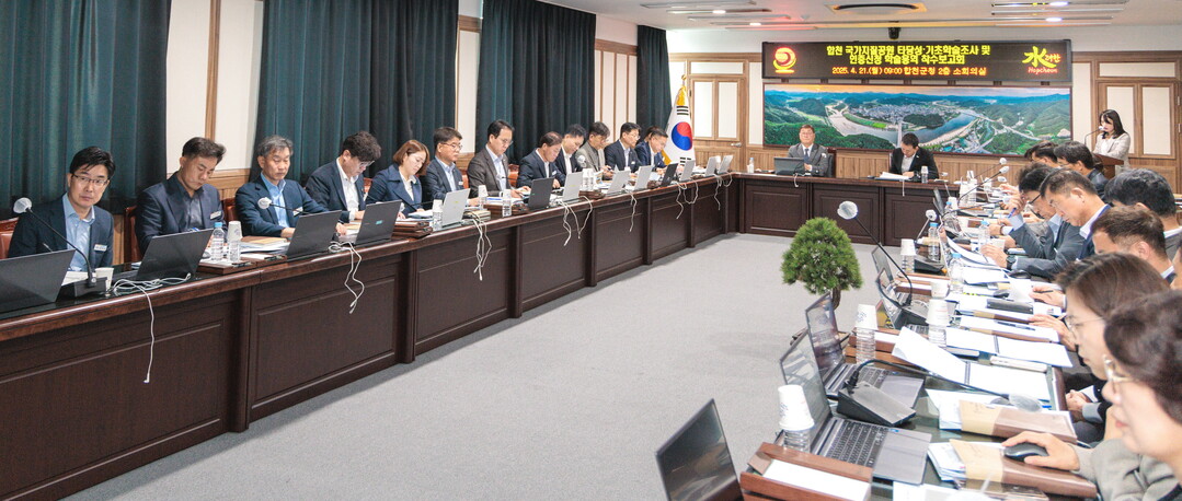 | ▲ 김윤철 군수가 21일 국가지질공원 인증 신청을 위한 용역 착수보고회를 주재하고 있다. [합천군 제공] |