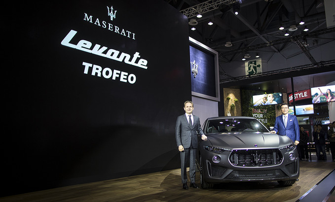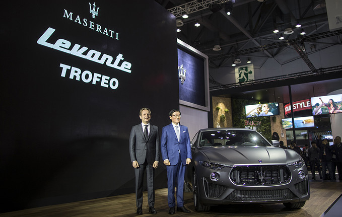 루카 델피노 마세라티 아시아중동 판매 총괄(왼쪽)과 김광철 FMK 대표가 28일 오전 경기도 고양시 킨텍스에서 열린 2019 서울모터쇼 프레스데이 행사에서 마세라티의 SUV '르반테 트로페오'를 공개하고 있다.