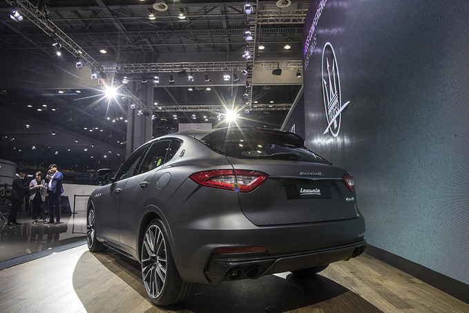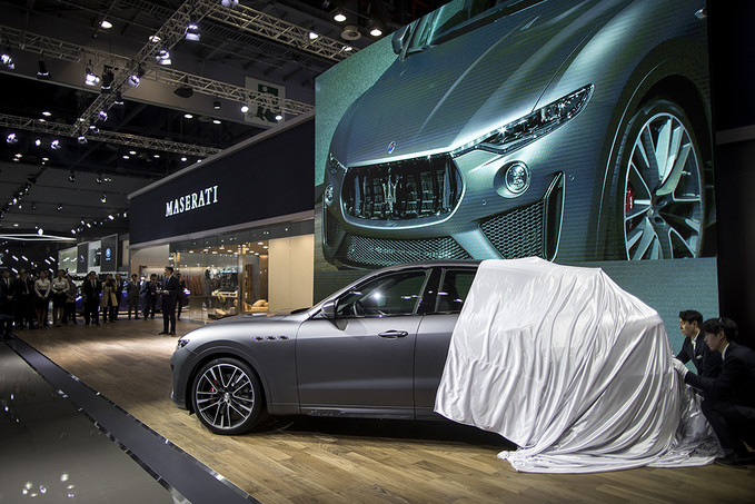 마세라티가 28일 오전 경기도 고양시 킨텍스에서 열린 2019 서울모터쇼 프레스데이 행사에서 마세라티의 SUV '르반테 트로페오'를 공개하고 있다.