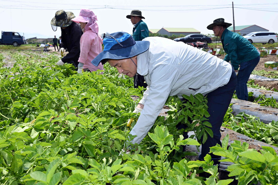 | ▲ 안병구 시장이 29일 하남읍 농가를 찾아 감자 수확 작업을 돕고 있다. [밀양시 제공] |