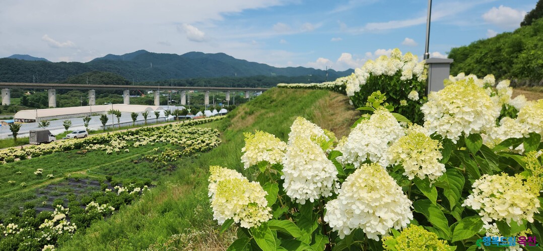 충북 옥천군 이원면 옥천묘목공원에 새하얀 수국이 활짝 피어한여름의 정취를 느끼려는 탐방