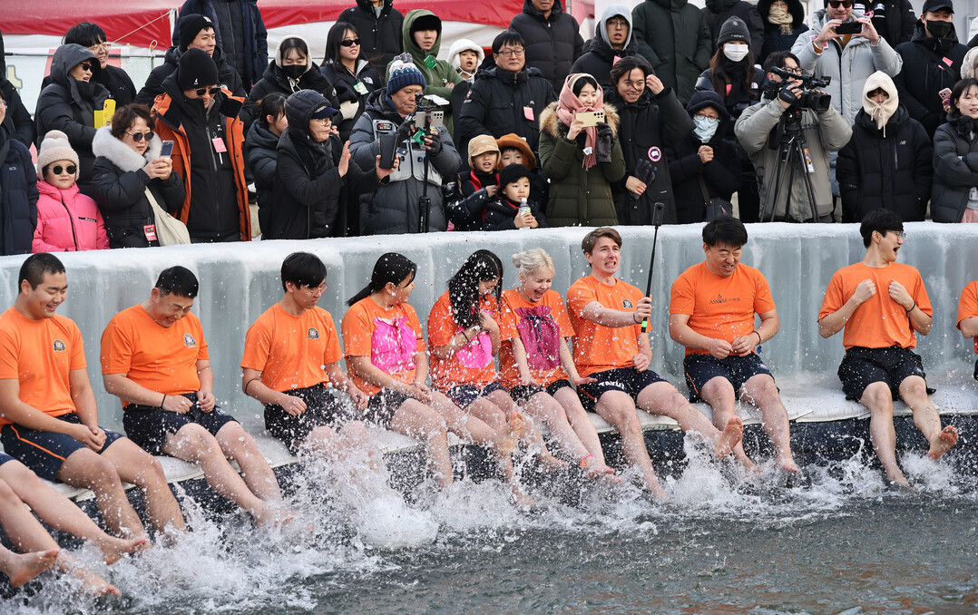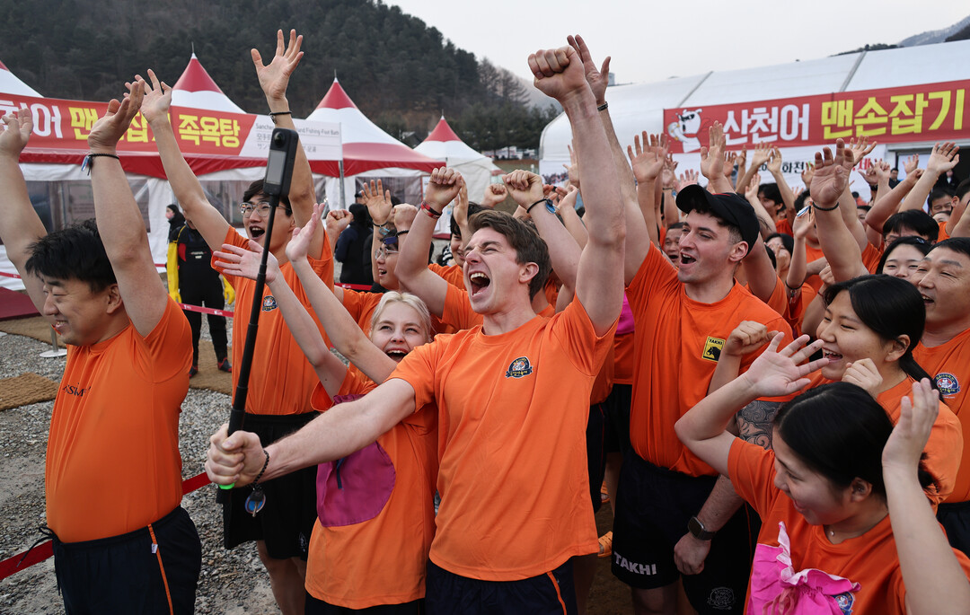 | ▲ 산천어 맨손잡기에 들어가는 참가자들이 구호를 외치고 있다. [이상훈 선임기자] |