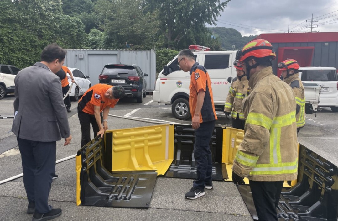 ▲ 지난해 공동주택 전기차 화재예방 예방장비 시연 모습 [양산시 제공]