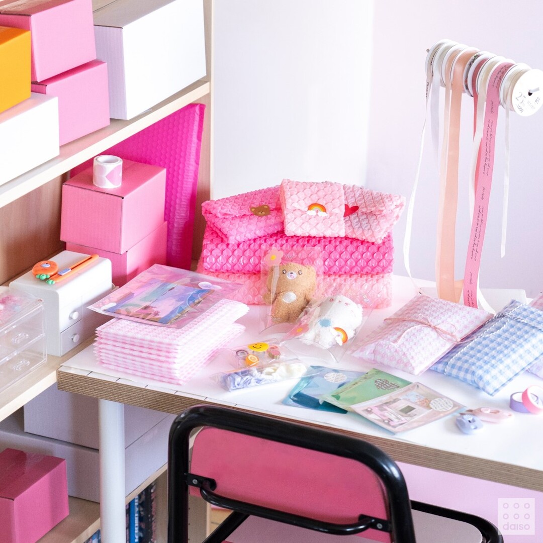 파스텔톤의 오렌지, 퍼플, 그린 등으로 구성한 '컬러 다용도박스'나 스카이블루, 연한 핑크 2종류 체크 패턴의 '디자인 에어캡 봉투'를 활용가능하다.
