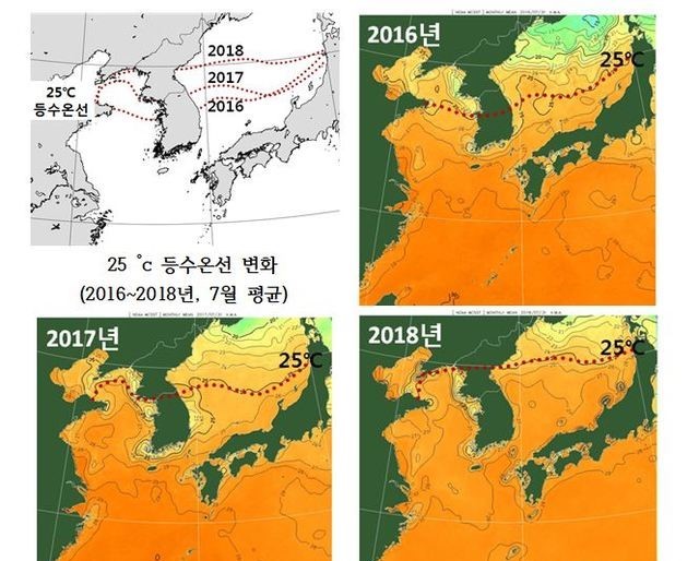 미국 해양대기청(NOAA) 극궤도 위성을 통해 2016년부터 올해까지 7월 평균 수온을 분석한 결과, 지난 2016년 7월의 평균 25도 등수온선은 태안과 울산 인근 해역에서 나타났으나 지난해에는 백령도와 속초, 올해는 평안북도와 함경남도 인근 해역까지 북상했다.