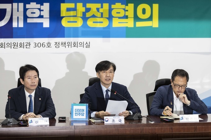 ▲ 조국 법무부 장관(가운데)이 18일 오전 서울 여의도 국회에서 열린 '사법개혁 및 법무개혁 당정협의'에 참석해 발언하고 있다. [문재원 기자]