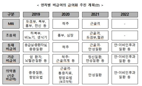 또 필수검사에 해당하는 MRI와 초음파는 2021년까지 단계적으로 건강보험이 적용된다. MRI 검사는 올해 두경부, 복부 흉부, 전신에 이어 2020년 척추, 2021년 근골격 순으로 확대되며 초음파 검사는 올해 하복부, 비뇨기, 생식기 다음으로 2020년 흉부와 심장, 2021년 근골격, 두경부, 혈관 순으로 적용범위가 늘어날 예정이다.