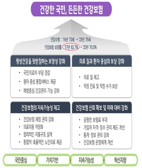 정부가 출생부터 노년까지 필수의료와 적정진료를 보장하는 건강보험 체계를 구축해 2023년까지 건강수명을 75세로 늘리고, 건강보험 보장률을 70%로 끌어올리기로 했다. 이와 함께 진료비 감액 혜택을 받는 노인의 연령 기준은 건강보험 재정 안정을 위해 65세에서 70세로 높일 계획이다.