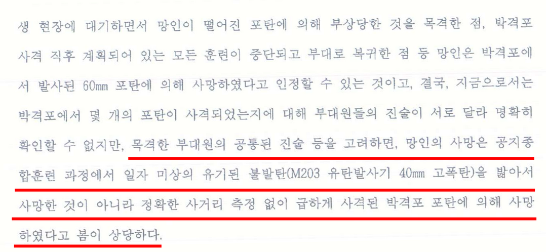 당시 군은 불발탄 사고로 정리했다. 훈련 중 실수로 'M203 유탄발사기 40㎜ 고폭탄 불발탄'을 밟아 목숨을 잃었다는 거였다.