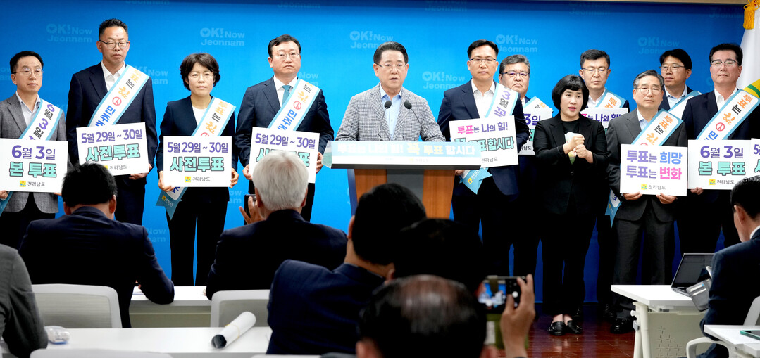 | ▲ 김영록 전라남도지사가 28일 오후 도청 브리핑룸에서 '제21대 대통령 선거 6·3대선 투표 동참' 대도민 담화문을 발표한 뒤 도청 간부들과 퍼포먼스를 하고 있다. [전남도 제공] |