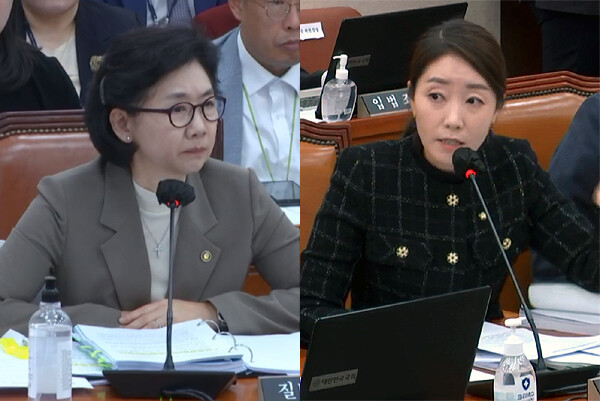 ▲ 11일 국회 보건복지위원회 국정감사에서 강선우 더불어민주당 의원이 김영미 질병관리청장(왼쪽)에게 질의하고 있다. [국회 인터넷의사중계시스템]