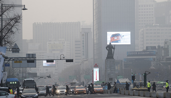▲ 수도권을 포함한 전국 곳곳에 미세먼지 비상저감조치가 발령된 지난 14일 오전 서울 종로구 광화문네거리 일대가 뿌연 미세먼지로 덮여 있다. [정병혁 기자]