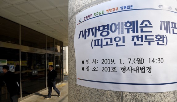 ▲ 사자명예훼손 혐의를 받고 있는 전두환씨의 형사재판이 열리는 7일 오후 광주지법에 재판 일시와 장소를 알리는 공고문이 붙어 있다. [뉴시스]