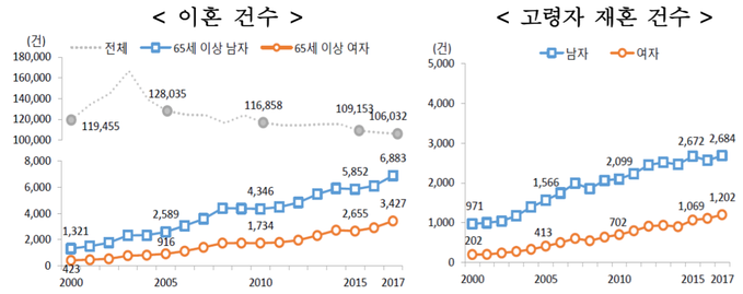 27일 통계청이 발표한 '2018 고령자통계'에 따르면 지난해 65세 이상 남성의 이혼 건수는 6883건, 여성은 3427건으로 조사됐다. 전체 이혼 건수는 전년보다 1.2% 감소했지만 65세 이상 남녀의 이혼 건수는 오히려 12.8%, 17.8% 각각 급증했다.