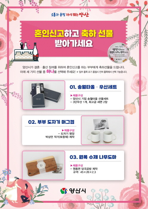 축하물품은 양산지역 기업의 송월타올·우산세트, 양산시 도예가 박상언 작가(토향재)의 부부 머그컵 세트, 원동면 당곡공방의 원목 수제 나무도마 등 세 가지 가운데 하나를 선택할 수 있다.