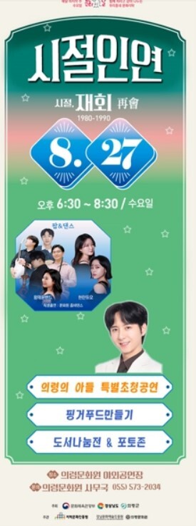 의령문화원 전시실에선 '시절인연 사진전'을 통해 의령의 옛 모습과 생활상을 되새겨 볼 수 있다. 마지막으로 '의령의 아들'로 불리며 대중적 사랑을 받고 있는 가수 강보민의 트로트 공연이 특별 무대로 예정돼 있다.