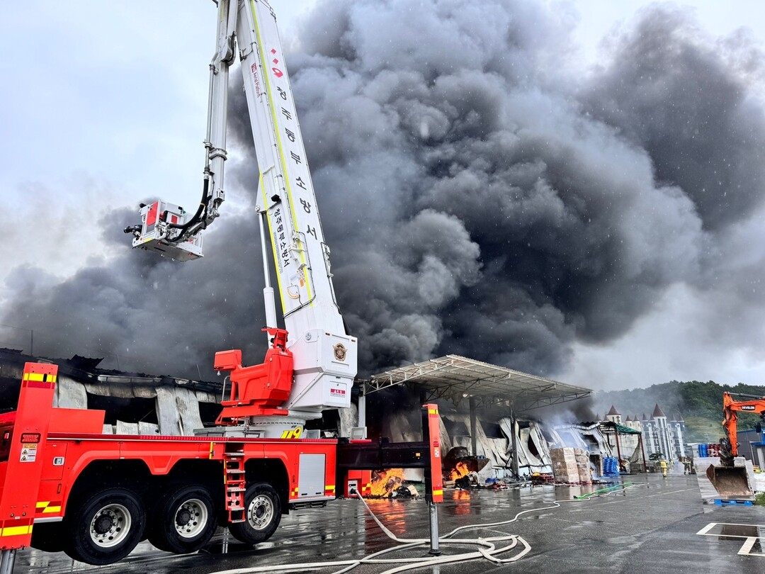 | ▲청주 오창 플라스틱 용기제조공장 화재현장.[충북소방본부 제공] |