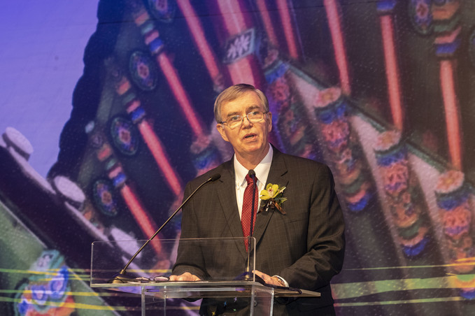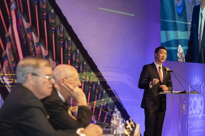 ▲ 짐 플린 글로벌피스재단 세계회장이 '2019 글로벌피스컨벤션'의 환영사를 하고 있다. [문재원 기자]