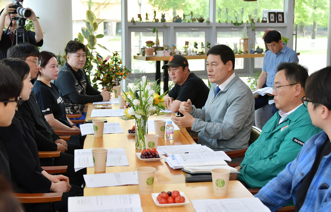 ▲ 정철원 전남 담양군수가 지난 5일 지역 농업의 미래를 이끌어 갈 청년농업인과 소통 간담회를 열고 애로사항을 청취하고 있다. [담양군 제공]