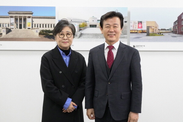▲조규일 시장이 12일 김성희 국립현대미술관장을 만난 뒤 기념촬영을 하고 있다. [진주시 제공]