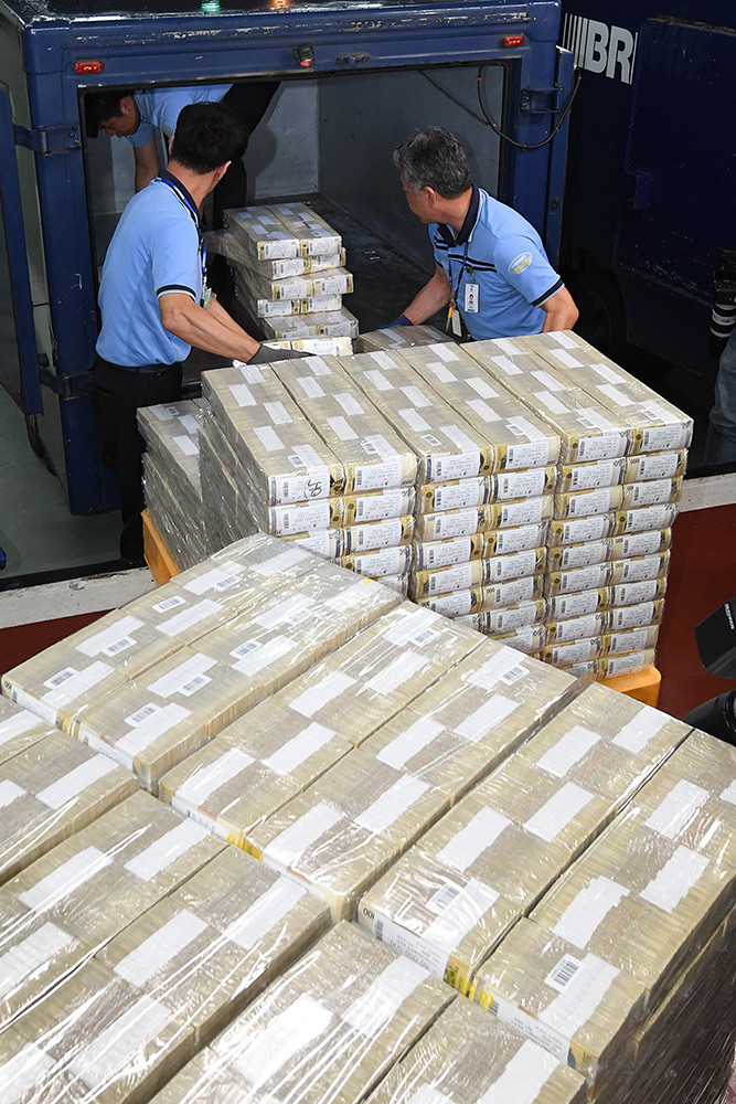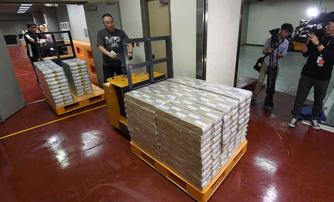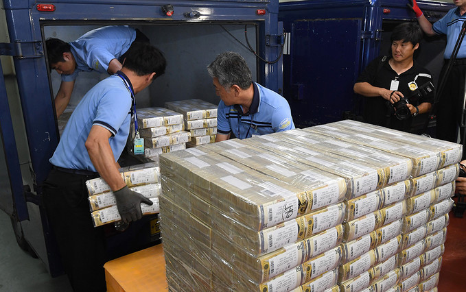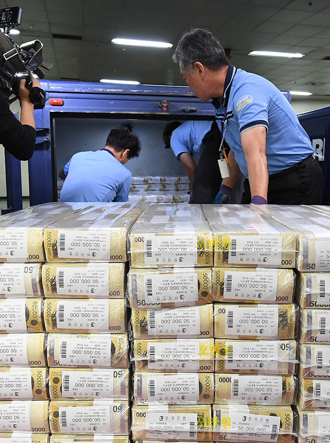 추석 명절을 앞둔 10일 오후 서울 강남국 한국은행 강남본부에서 현금운송 관계자들이 추석자금 방출작업을 하고 있다.