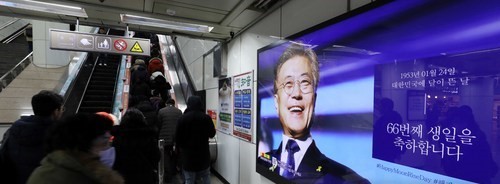 ▲ 2018년 1월 24일 오전 문재인 대통령의 66번째 생일을 맞아 서울 종로구 지하철 광화문역에 설치된 생일축하 광고판 앞으로 시민들이 지나가고 있다. [뉴시스]