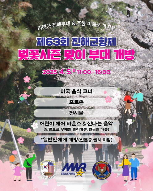 이성민 문화관광체육국장은 "미해군 부대 개방은 오직 진해군항제에서만 경험할 수 있는 특별한 기회"라며 "많은 시민·관광객들이 방문, 다양한 프로그램을 체험하길 바란다"고 전했다.