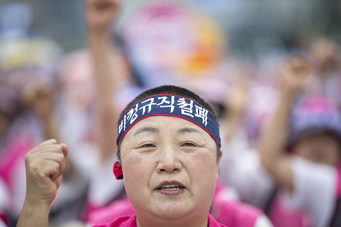 ▲ 전국학교비정규직연대회의(학비연대) 조합원들이 3일 오후 서울 종로구 광화문광장에서 열린 '비정규직 철폐, 공정임금제 쟁취!, 2019총파업 투쟁승리 학교비정규직(교육공무직) 노동자 총파업대회'에서 구호를 외치고 있다. [정병혁 기자]