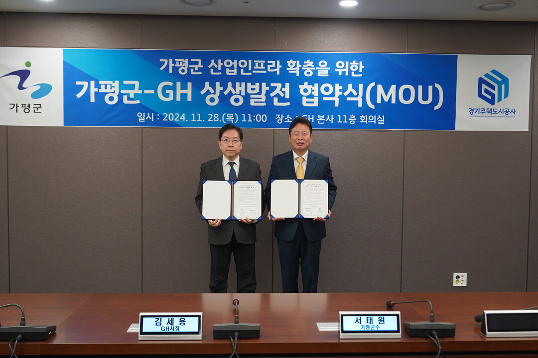 경기주택도시공사(GH)는 28일 광교 GH 본사에서 김세용 GH 사장, 서태원 가평군수가 참석한 가운데 가평군과 '가평군 산업인프라 확충을 위한 가평군-GH 상생발전 협약'을 체결했다고 밝혔다.
