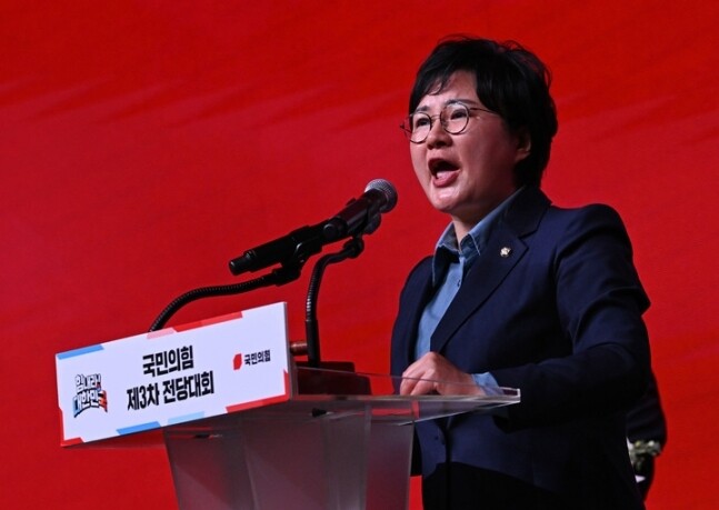 ▲ 지난 3월 8일 경기 고양시 킨텍스에서 열린 국민의힘 전당대회에서 조수진 최고위원이 연설하고 있다. [뉴시스]