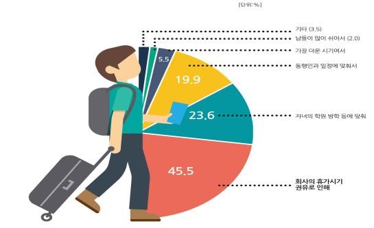 하계휴가 출발 예정 비율이 가장 높은 7월 말∼8월 초(7월 28일∼8월 10일)에 휴가를 계획한 이유로는 '회사의 휴가시기 권유로 인해'(45.5%), '자녀의 학원 방학 등에 맞춰'(23.6%), '동행인과 일정에 맞춰서'(19.9%) 등의 순으로 나타났다.