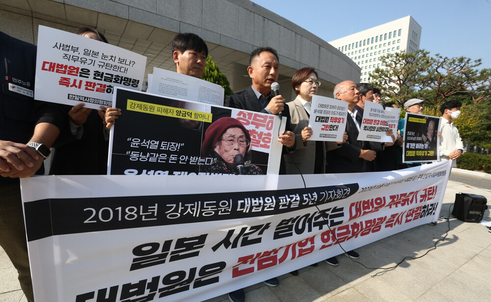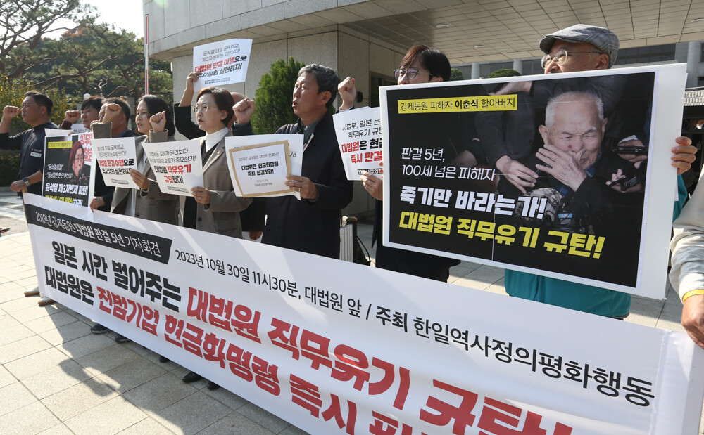 공동행동은 “2018년 10월 30일에 ‘일본 기업은 강제동원 피해자에게 배상하라’는 강제동원 대법원 판결이 있었지만 이러한 역사적 판결에도 정작 판결 이행은 제대로 되고 있지 않은 상황”이라며 “현재 판결 이행 절차는 일본 피고기업 자산에 대한 현금화명령(매각)만 남았지만, 대법원은 판결을 지체시키고 있다”고 주장했다.