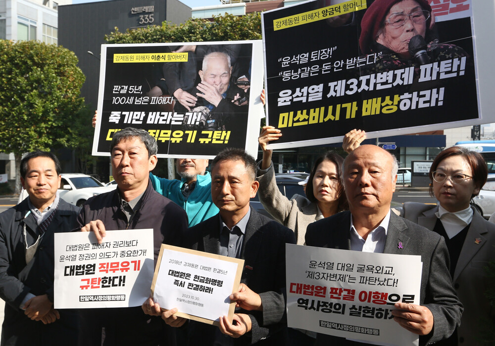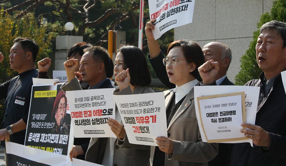 공동행동은 또한 “일본 기업은 여전히 자신의 범죄를 인정하지 않으며 대법원판결 자체를 부정하고 있는 사이 윤석열 정부는 대일 굴욕외교를 하며 ‘제3자변제’로 대법원 판결을 무효화하려는 시도를 서슴지 않았다”고 규탄했다.