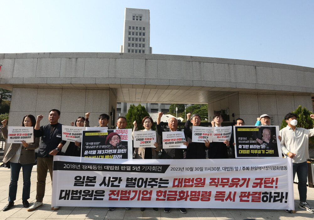 30일 오전 서울 서초동 대법원청사 앞에서 역사정의와 평화로운 한일관계를 위한 공동행동 주최로 ‘일본 시간 벌어주는 대법원 직무유기 규탄! 대법원은 전범기업 현금화명령 즉시 판결하라!’ 기자회견이 열렸다.