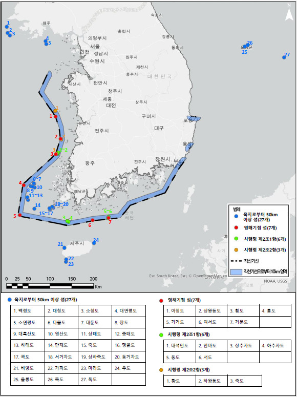 전국 43개 가운데 전남은 25개 섬이 해당되며, 시군별로 여수 3, 영광 4, 완도 1, 진도 6, 신안 11곳이다.
