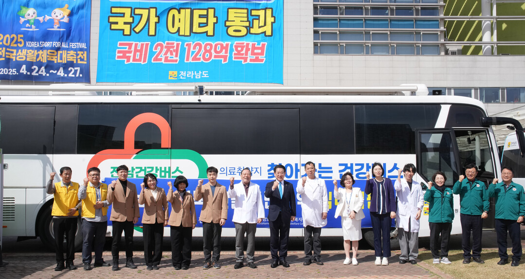 ▲ 김영록 전라남도지사가 28일 전남도청 앞 광장에서 대형산불 발생으로 인해 재난지역으로 선포된 경북지역에 주민들의 진료와 심리상담을 지원하기 위해 출발하는 전남도 건강·안심버스 의료진, 직원과 파이팅하고 있다. [전남도 제공]