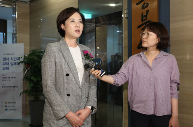 ▲ 유은혜 사회부총리 겸 교육부 장관이 4일 오후 서울 서대문구 동북아역사재단에서 열린 '일제 식민지 피해 실태와 과제 공동 심포지엄'에 참석해 취재진의 질문에 답변하고 있다. [뉴시스]