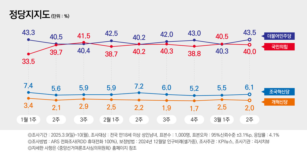 정당 지지도…민주당 43.5% 국민의힘 40.0%