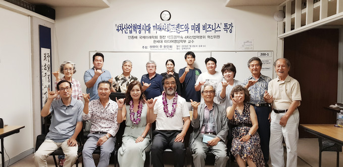 하와이주 한인회는 지난 3일 임팩칼리지에서 대통령직속 4차산업혁명위원회 혁신위원이자 국제미래학회 원장인 한세대 미디어영상학부 안종배 교수를 초청해 '4차 산업혁명 미래 트렌드와 미래 비즈니스' 특강과 대담을 개최했다.